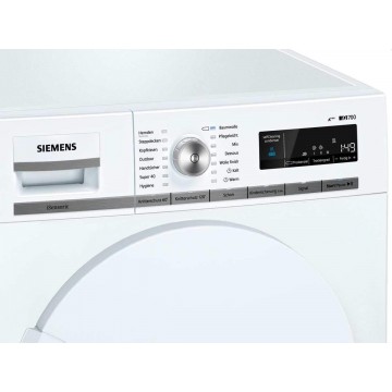 Rendimiento y consumo Capacidad nominal para el programa de algodón estándar con carga completa: 8 kg de ropa de algodón Tipo de secado: condensación con tecnología de bomba de calor Clase de eficiencia energética: A+++ Consumo de energía de 176,0 kWh/año basado en 160 ciclos de secado para el programa de algodón estándar con carga completa y parcial, así como el consumo de los modos de funcionamiento de bajo consumo. El consumo real de energía por ciclo depende del tipo de uso del aparato. Consumo de energía del programa estándar de algodón con carga completa 1,46 kWh y consumo de energía del programa estándar de algodón con carga parcial 0,82 kWh. Consumo en modo apagado 0,1 W y 0,1 W en modo no apagado 0,1 W Duración en estado no apagado: 30 min El programa de secado de algodón en armario es el predeterminado. Programa de secado al que se refiere la información que aparece en la etiqueta y en la ficha técnica. Este programa es adecuado para secar tejidos de algodón normalmente húmedos y es el más eficiente energéticamente para el algodón. Duración del programa estándar de algodón con relleno total y parcial: 117 min. La duración del programa de algodón estándar con llenado completo es de 148 min y la duración del programa de algodón estándar con llenado parcial es de 94 min. Reducción de condensación Clase de eficiencia B en una escala de G (mínima eficiencia) a A (máxima eficiencia). Eficiencia de condensación promedio del programa de algodón estándar con llenado completo del 87% y eficiencia de condensación promedio del programa de algodón estándar con llenado parcial del 89%. Eficiencia de condensación ponderada del programa de algodón estándar 88%. Nivel de potencia sonora: 62%. dB (A) re 1. pW programas Programas especiales: acabado de lana, mezclas, toallas, edredones, almohadas, programa de tiempo caliente, programa de tiempo frío, algodón, sintéticos, alergia plus/higiene, sportivePlus, lencería, super 40, blusas/camisas Opciones antiarrugas 120 min en el programa de desmontaje Botones de control: ya, señal, inicio diferido o tiempo de finalización, inicio/pausa, objetivos de secado, botón de encendido, peso de secado. Ajuste fino, seguridad para niños de 3 segundos, protección contra arrugas de 60 minutos, protección contra arrugas de 120 minutos, inicio retardado de 24 horas Comodidad y seguridad Condensador autolimpiable: no es necesario limpiar el condensador AutoDry: programas de secado controlados por humedad, selección de programas con interruptor de encendido/apagado integrado, pantalla LED grande y clara para el tiempo restante y las 24 horas. Adelanto del fin de los tiempos. Estado del programa, funciones adicionales. Sistema de tambor softDry: gran tambor de acero inoxidable, transductor con diseño suave antivibración: mayor estabilidad y silencio. Iluminación interior del tambor: LED de seguridad para niños. Señal en la puerta de plástico blanca.Cierre cómodo. Información técnica: Dimensiones del dispositivo (Alto x Ancho x Profundidad): 84,2 cm x 59,8 cm x 65,2 cm diferencial de 85 cm N. Altura del nicho