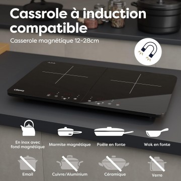 • Grande Application: Convient les casseroles et bols de 12 à 28cm spéciaux pour cuisinières à induction. Si aucun ustensile de cuisson n'est détecté, la cuisinière à induction s'éteint automatiquement dans 60s