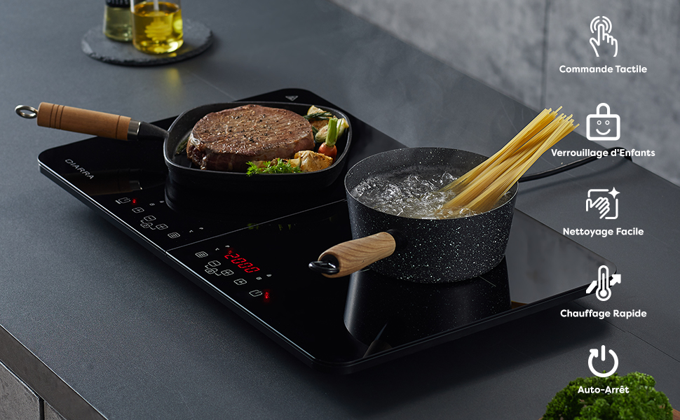 • Ultra-mince : Double plaque à induction dispose de deux zones de cuisson, qui peuvent être contrôlées indépendamment. Chauffage rapide par induction électromagnétique pour raccourcir le temps de cuisson