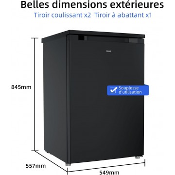 • Le mini-congélateur armoire CHiQ offre une capacité volumineuse de 90 litres tout en conservant un faible espace au sol(549*557*845mm). C'est un petit congélateur de plus idéal pour la cuisine, le garage, le bureau et le dortoir.