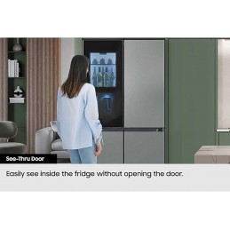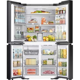 Réfrigérateur à portes françaises Samsung RF65DG970E22, capacité totale de 645 litres, niveau sonore de 37 dB, système de refroidissement ventilé triple, double fabrication de glace automatique dans le congélateur, connectivité Wi-Fi via SmartThings, inverseur numérique, 3 clayettes, 6 balconnets, 2 tiroirs à légumes, carafe à remplissage automatique. Ce réfrigérateur multi-portes est idéal pour conserver vos aliments dans les meilleures conditions. L'espace boisson intégré au food showcase comprend un distributeur d'eau et une carafe à remplissage automatique pour de l'eau fraîche et aromatisée à tout moment. La partie réfrigérateur, d'une capacité de 395 litres, dispose d'un système de froid ventilé pour une répartition uniforme et constante de l'air. Le congélateur, d'une capacité de 250 litres, est équipé d'une double fabrication de glace automatique et peut être contrôlé et programmé via votre smartphone grâce à la connectivité Wi-Fi. La technologie Chef Mode maintient la température stable (±0,5°C) pour garder vos aliments frais plus longtemps.