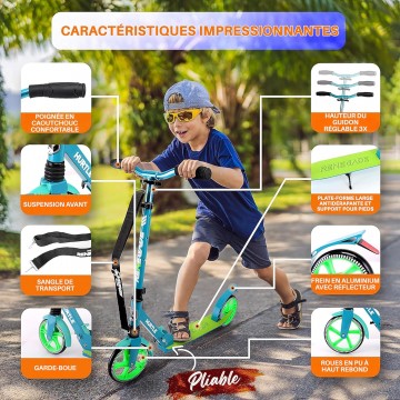 • EASY MANEUVERABILITY: Thanks to its advanced design, this scooter for boys/girls offers effortless control, allowing you to easily steer in any direction. In addition, its rear PU foot brake with reflection ensures smooth and safe stops.